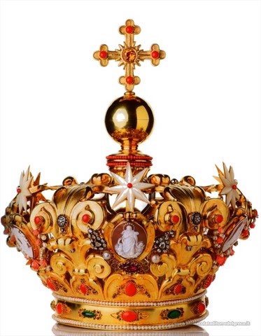 Leggiadre ghirlande con coralli, perle coltivate e zirconi fanno festa ai cammei; sei belle toppe di brillanti, diamanti e perle, dono dei fedeli, li fiancheggiano, ed una serie di sei grandi stelle in madreperla e coralli su fondo oro li sormontano.