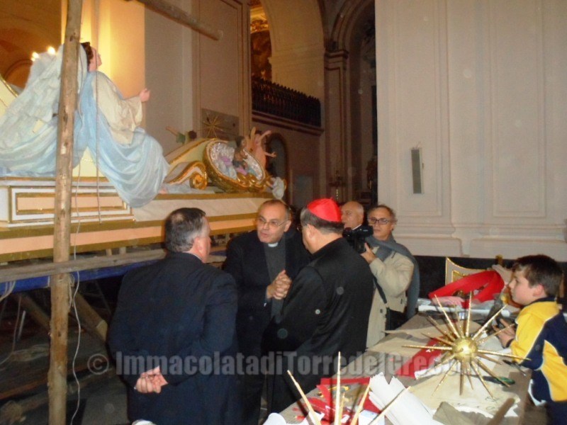 29/11/2012 Il Cardinale di Napoli,Crescenzio Sepe,visita la costruzione del Carro trionfale dell'Immacolata nella Basilica di Santa Croce.