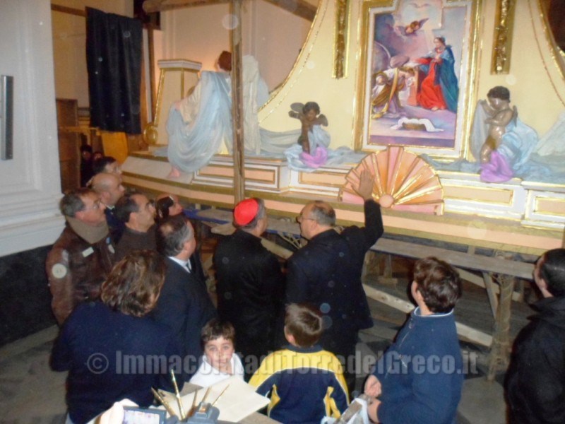 29/11/2012 Il Cardinale di Napoli,Crescenzio Sepe,visita la costruzione del Carro trionfale dell'Immacolata nella Basilica di Santa Croce.