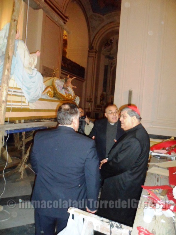 29/11/2012 Il Cardinale di Napoli,Crescenzio Sepe,visita la costruzione del Carro trionfale dell'Immacolata nella Basilica di Santa Croce.