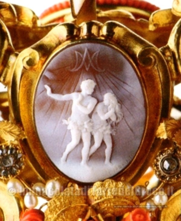 Cammeo laterale della Corona dell'Immacolata:Adamo ed Eva cacciati dal paradiso terrestre.Incisore Vincenzo Ciaravolo