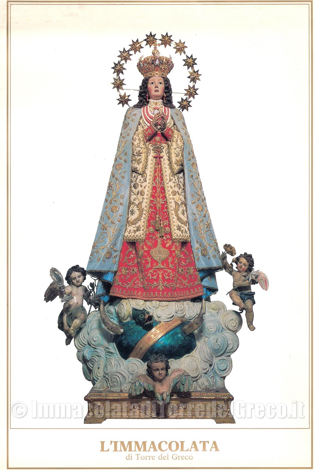 Infine l'Immagine dell'Immacolata è decorata con orecchini e collane di corallo, dono dei fedeli.La statua poggia su un globo terracqueo percorso dalla fascia stellata (segno della regalità dell'Immacolata sull'universo intero). Ed ancora una mezza luna sotto i suoi piedi a simboleggiare la volubilità e l'instabilità della natura umana, in contrasto con la coraggiosa fermezza di Maria.Tra i piedi e la luna è collocato un serpente, il demonio, con la mela tra i denti.